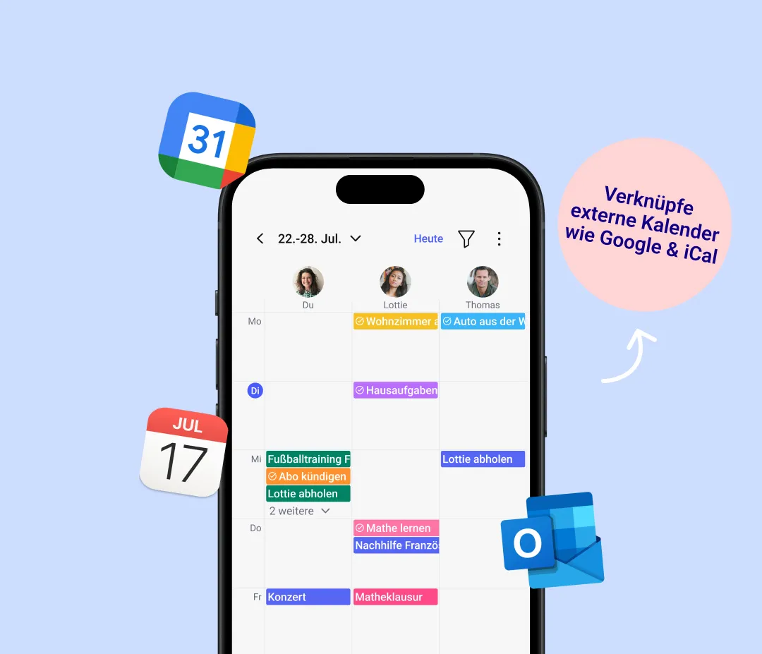 Mit dem Familienplaner habt ihr alle Termine und Aufgaben stets im Blick. Dank Family+ kannst du den Kalender in der Bling App mit deinen externen Kalendern verknĂĽpfen, bestimmte Arten von Aufgaben und Terminen nach Farbe sortieren und die Sichtbarkeit fĂĽr Familienmitglieder anpassen.