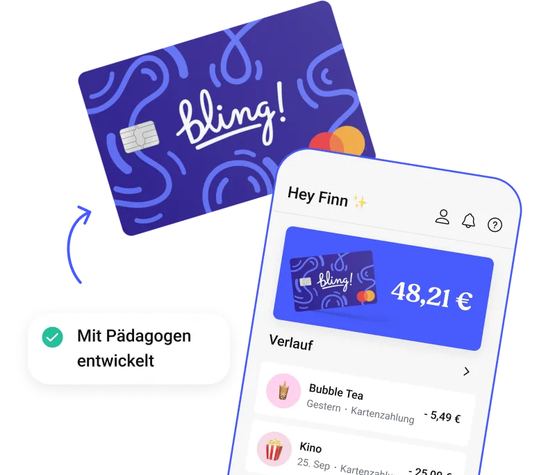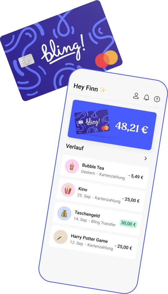 Mit der Bling Card lernt dein Kind den sicheren Umgang mit digitalem Geld. Und du hast per App dabei alles im Blick!