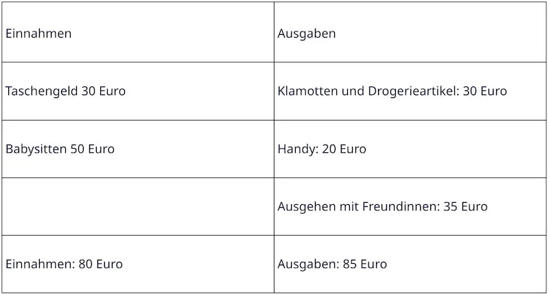 Mit einer Übersicht über Einnahmen und Ausgaben hilfst du deinem Kind, einen Überblick über seine Finanzen zu bekommen und zu sehen, wo Sparpotenziale liegen. So könnte eine solche Übersicht für ein durchschnittliches Teenager-Mädchen von ca. 14 Jahren aussehen.