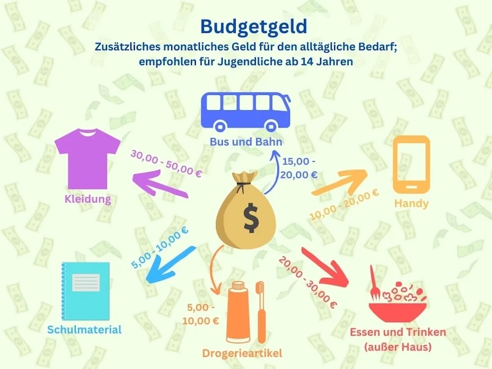 Das Taschengeld können deine Kids ausgeben, wofür sie möchten. Ohne Vorgaben, ohne Auflagen. Wenn du sie noch ein bisschen geldklüger machen möchtest, führst du zusätzlich ein Budgetgeld ein. Das wird für Jugendliche ab 14 Jahren empfohlen und ist ein Extra-Geld für den alltäglichen Bedarf. Also zum Beispiel für Schulsachen, Klamotten, Kosmetik oder die Busfahrkarte.
