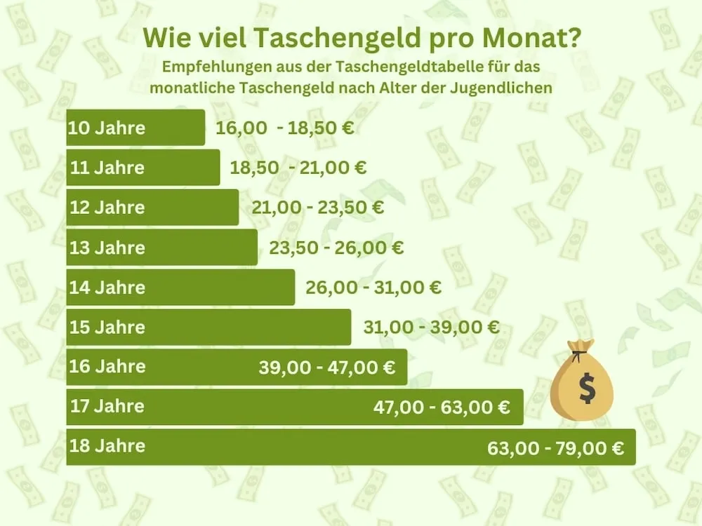 Experten empfehlen, das Taschengeld ab einem Alter von 10 Jahren monatlich auszuzahlen. Am Anfang am besten 16,00 bis 18,50 € jeden Monat.