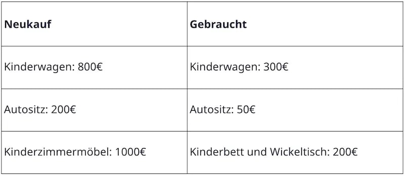 Auch hier lassen sich nicht alle Familien über einen Kamm scheren. Wer kein Auto fährt, braucht z.B. keine Babyschale für den PKW. Wer sein Kind lieber tragen möchte, kann sich die Investition in einen Kinderwagen sparen. Auch ein eigenes Zimmer braucht der Nachwuchs nicht, die Nähe zu Mama und Papa ist da viel wichtiger, auch wenn es vielen Eltern einen unermesslichen Spaß macht, ein Babyzimmer einzurichten. Selbst dann muss die Einrichtung nicht zwingend neu sein. Der Markt ist voll von gut erhaltenen gebrauchten Kindermöbeln.