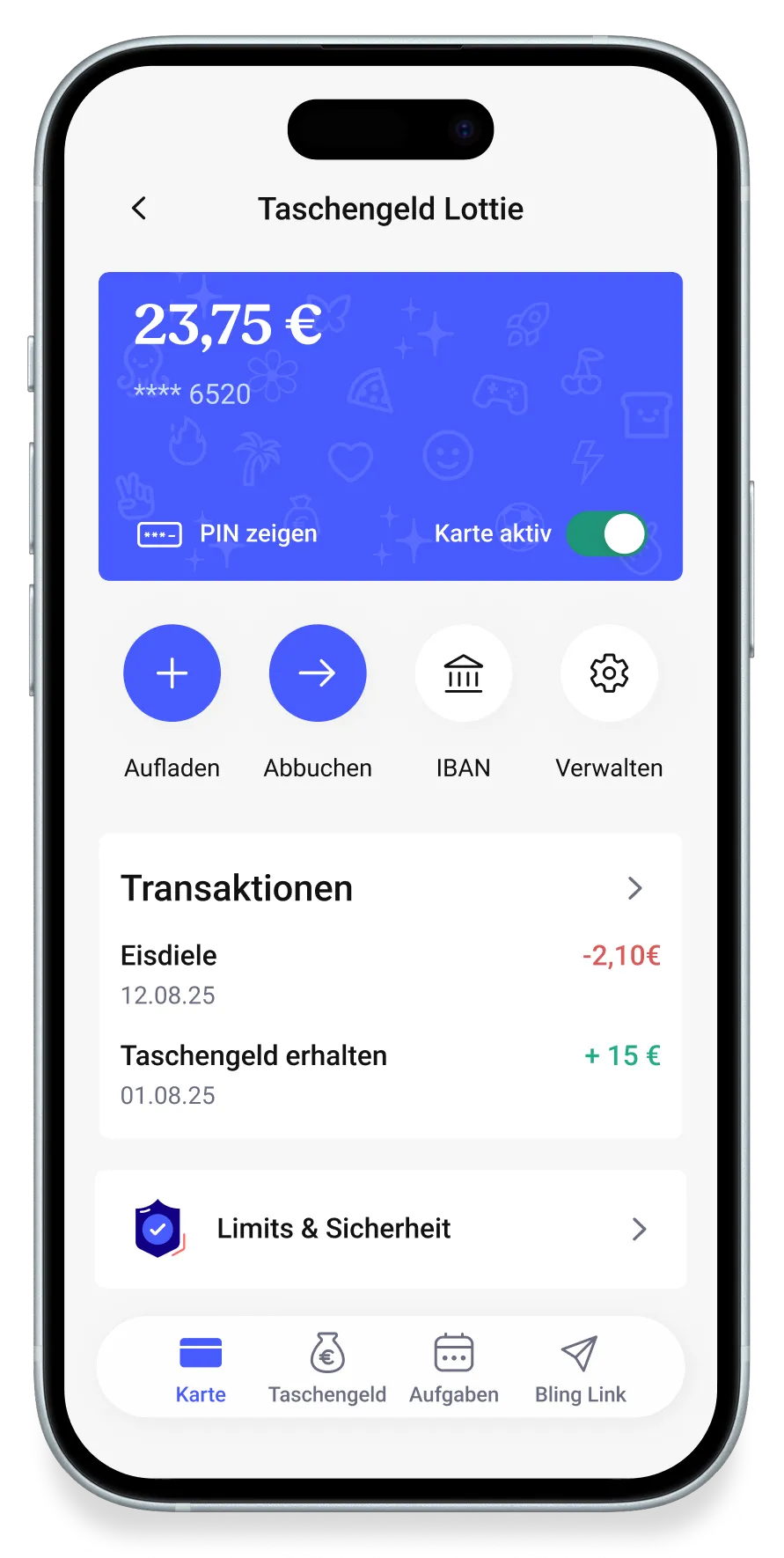 Dein Kind muss mindestens 7 Jahre alt sein, um mit einer Bling Card zu bezahlen. Danach wächst Bling mit deinem Kind. Je älter es wird, desto mehr Freiheiten kannst du geben.